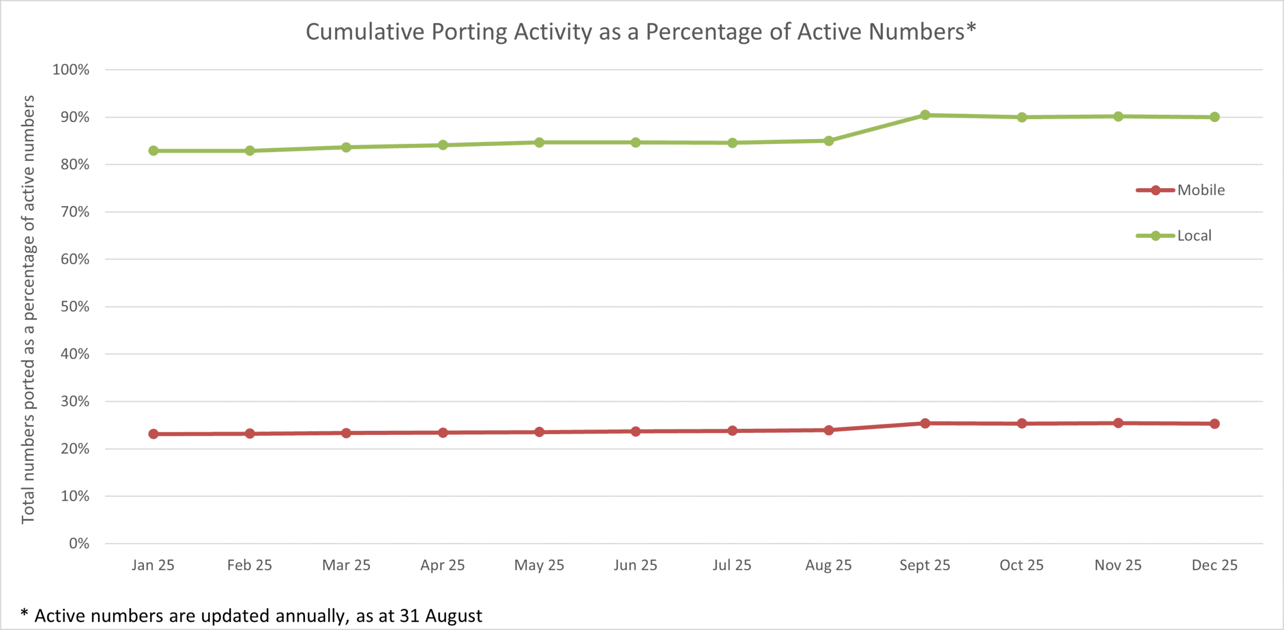 This graph shows how many numbers are ported at a specific time as a percentage of the total active numbers. The count of ported numbers is updated monthly; however, the count of active numbers is only updated annually, as at 31 August.