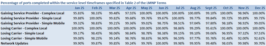 This table shows the percentage of ports completed within the service level timeframes specified in the Determination. The data in this table has been broken down to show the percentage of ports that meet the service level requirements by gaining service provider and losing service provider and by port type, as well as network updates. This breakdown matches what is used for the monthly monitoring to determine when there has been a breach of service levels by a Party to the LMNP.